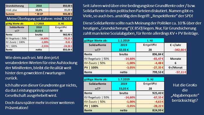 Aber lassen wir Norbert Böttcher und die Redaktion „Steuertipps“ zu Wort kommen: „Der Zahlbetrag der Grundrente wird 2021 bei 35 Beitragsjahren in allen Fällen zwischen 613 und 865 Euro liegen und damit vielfach unter der Grundsicherung von aktuell 808 Euro. Dieses auf den ersten Blick überraschende Ergebnis hat mit den Beiträgen zur gesetzlichen Kranken- und Pflegeversicherung zu tun. Die Grundrente ist wie jede Rente beitragspflichtig. Das heißt, von der erreichten Rente brutto und dem Zuschlag auf diese Bruttorente ist noch der Beitrag zur gesetzlichen Kranken- und Pflegeversicherung abzuziehen, der von der Deutschen Rentenversicherung bei der Zahlung der gesetzlichen Rente direkt einbehalten wird. Im ersten Gesetzentwurf des Bundessozialministeriums zur Grundrente vom 21.5.2019 heißt es auf Seite 23 ausdrücklich: ‚Die Grundrente führt zu höheren Beiträgen in die gesetzliche Krankenversicherung und soziale Pflegeversicherung‘.