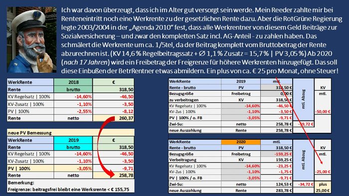 Diese vermeintliche Wohltat wird Milliarden kosten, Geld, das anderswo fehlt. Es fehlt beispielsweise, um die berechtigten Forderungen der Direktversicherungsgeschädigten einzulösen. Sie werden seit 2004 vom Staat abgezockt, denn sie zahlen in der Renten mit dem Arbeitgeber- und Arbeitnehmeranteil doppelte Versicherungsbeiträge – und das, obwohl viele schon in der Einzahlphase Beiträge gezahlt haben. Um sie wenigstens ein bisschen ruhig zu stellen, wurde, sozusagen als Beifang zur Grundrente, ein Freibetrag von 159,25 Euro eingeführt dank dessen Direktversicherte und Betriebsrentner monatlich annähernd 30 Euro an Beiträgen sparen. Bei vielen sind es sogar weniger als 30 Euro, wie Böttcher ausgerechnet hat.