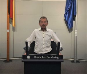 hielt diese fiktive Rede nicht im Bundestag, sondern jüngst im Deutschen Dom am Gendarmenmarkt zu Berlin. Hier ist eine Dauerausstellung über die Geschichte der parlamentarischen Demokratie in Deutschland installiert und dabei Sitzungsaal des Deutschen Bundestags als Vortragsraum für Besucher nachgebaut – und damit auch das originale Rednerpult, wo sich Besucher fotografieren lassen können oder auch eine „Rede ans deutsche Volk“ halten können, wie eben unser Rudi Birkmeyer.