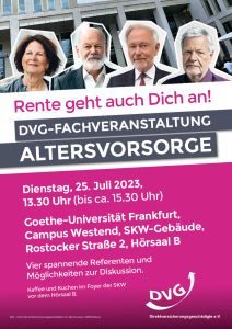 Nochmals als schöner Reminder: der DVG – Verein der Direktversicherungsgeschädigten e.V. veranstaltet am Dienstag, 25. Juli 2023, Beginn 13.30 Uhr an der Goethe-Universität in Frankfurt die „DVG-Fachveranstaltung Altersvorsorge” durch.