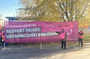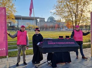 Vor dem Kanzleramt in Berlin halten derzeit Mitglieder des DVG – Direktversicherungsgeschädigten e.V. Mahnwache. Es gilt, den Kanzler daran zu erinnern, dass er mehrfach den Stopp der Doppelverbeitragung auf Direktversicherungen und Betriebsrenten versprochen hat und nun seine Versprechen einhalten sollte.